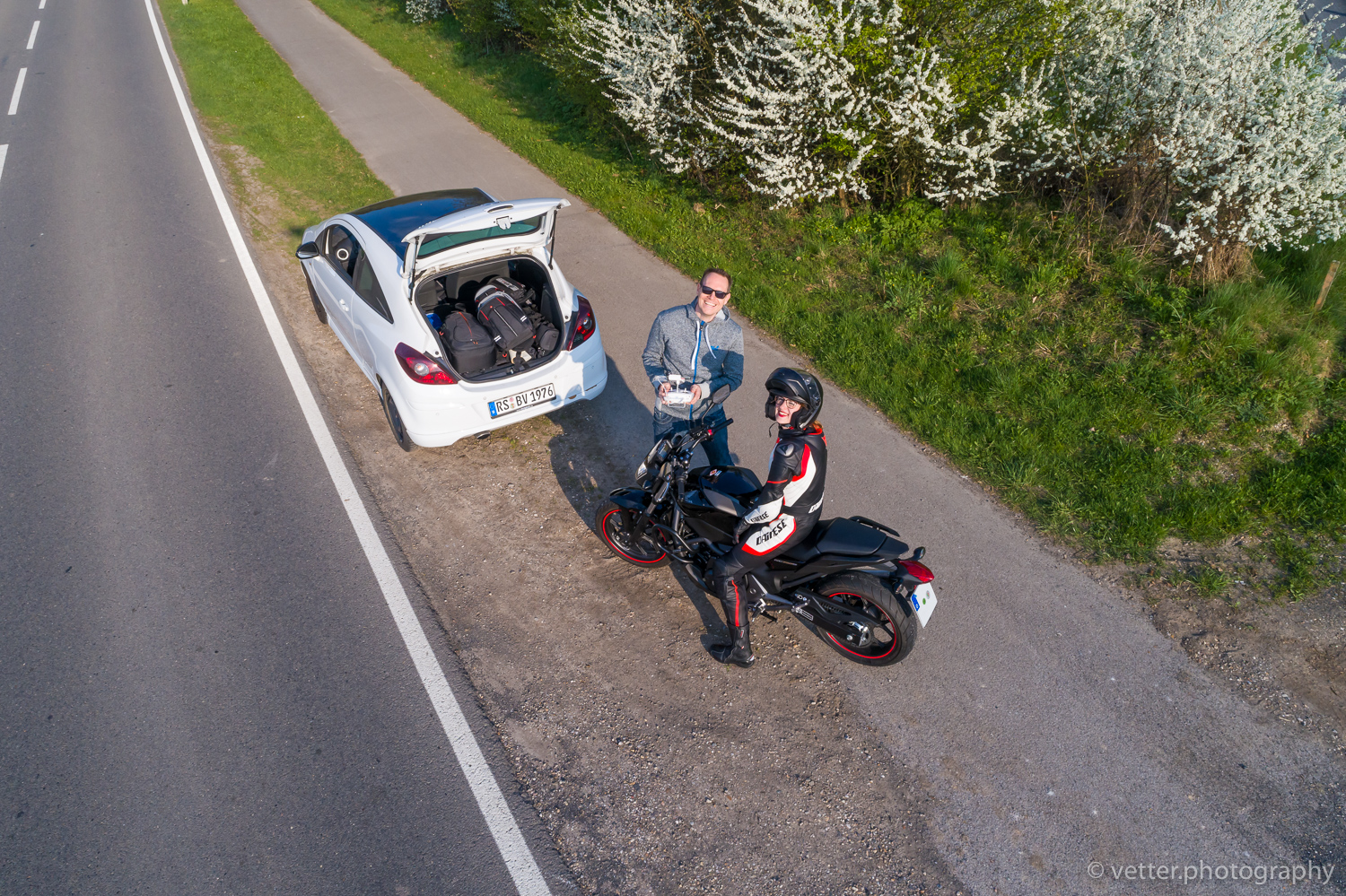 Auf einer abgelegenen  Landstraße kam dann noch unsere Kameradrohne zum Einsatz. Eigentlich wollte ich ein Video drehen, doch leider klappte das (meinerseits) nicht so ganz. Ich denke das Video holen wir zu einem späterem Zeitpunkt nach. Ein paar Luftaufnahmen sind dennoch dabei rumgekommen 🙂